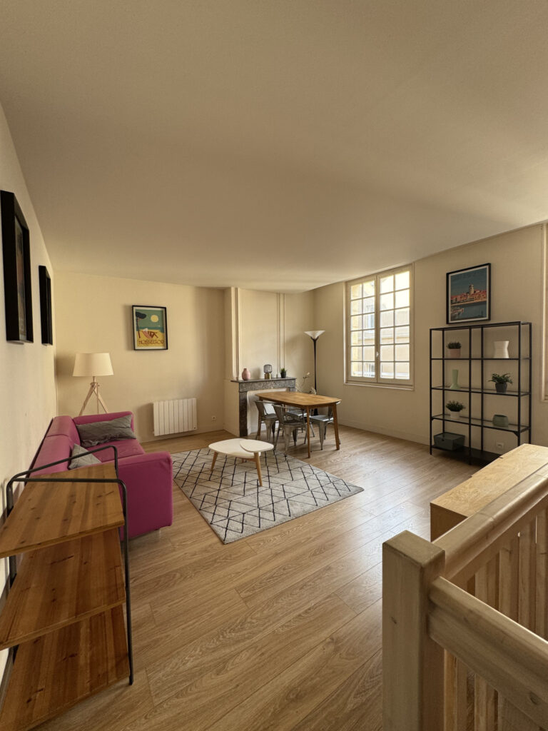 L’appartement propose au rez-de-chaussée un vaste séjour lumineux avec cuisine équipée, un grand salon, un WC séparé.