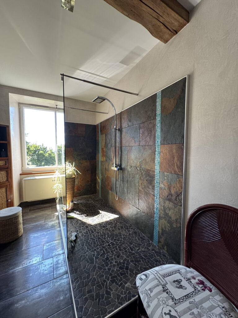 Un grand salon chaleureux avec sa cheminée d’origine, un bureau cathédrale, une buanderie, une salle d’eau et un WC indépendant complètent le rez-de-chaussée.