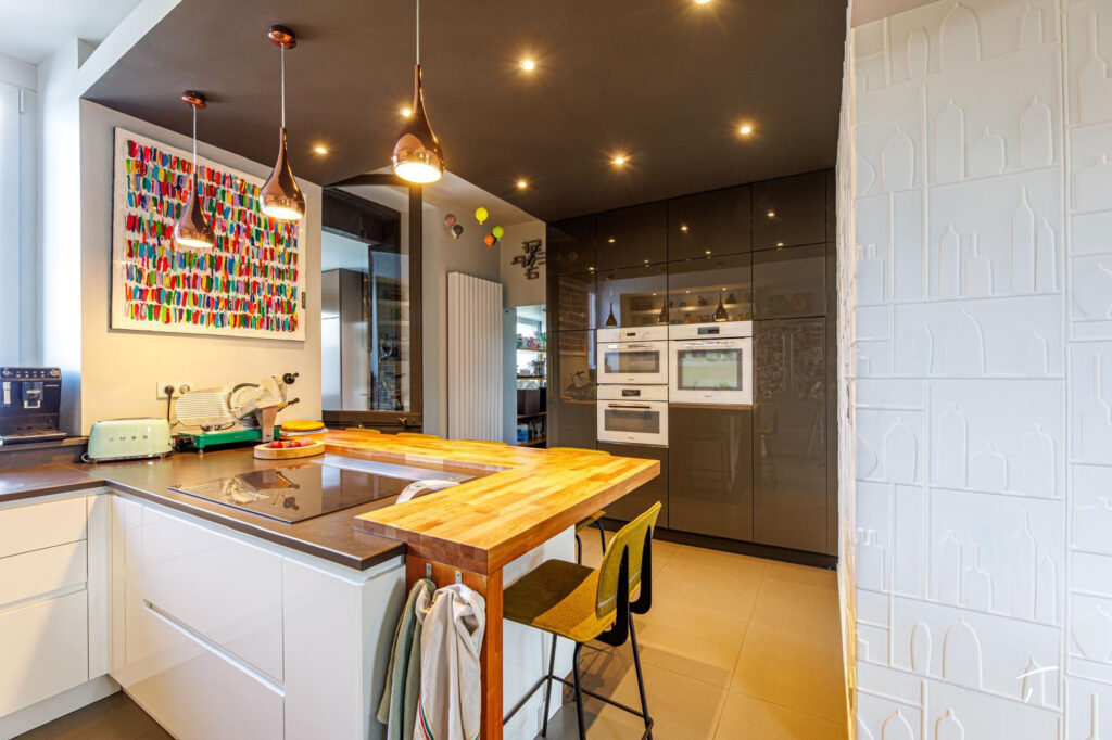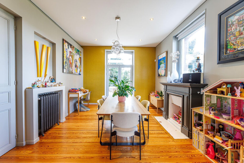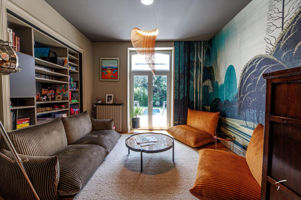 Le rez de chaussée propose une grande cuisine de standing avec un ilot central mais aussi un espace repas plus convivial autour d’une grande table ; plus loin un salon double avec cheminée ; les pièces sont baignées de lumière, et donnent toutes sur le jardin et sa piscine.