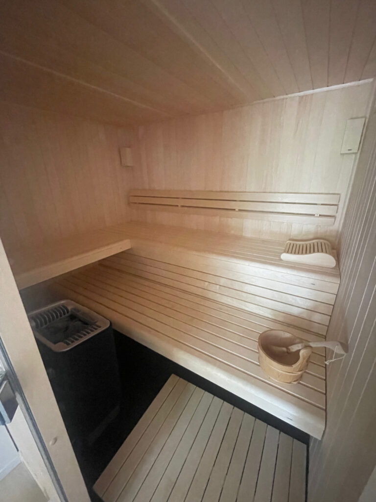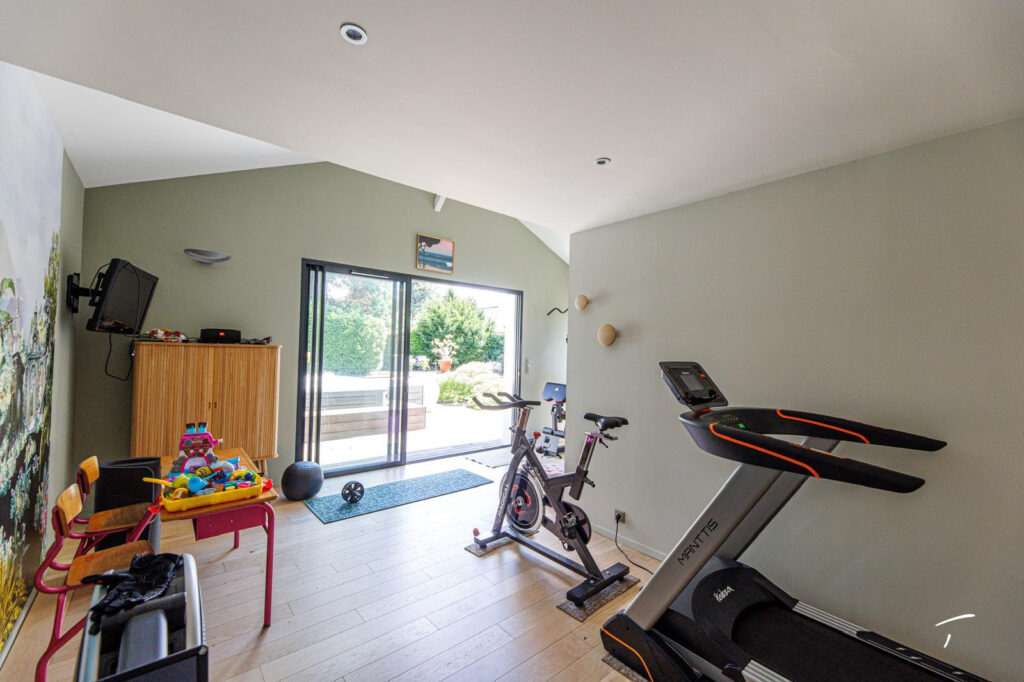 La piscine longue de 12 mètres est sécurisée par un volet roulant, le jacuzzi et le sauna ainsi qu’une salle de sport avec douche et toilettes sont bien sûr au rendez-vous.