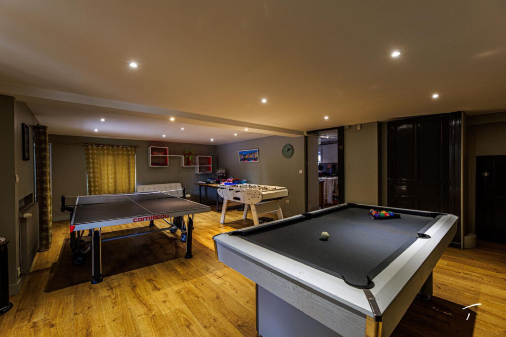 Enfin, le sous-sol intégral ravira les petits et les grands puisqu’il propose diverses possibilités ; salle de jeux ( billard, baby foot, ping pong), salle de cinéma. Il abrite déjà la buanderie.
